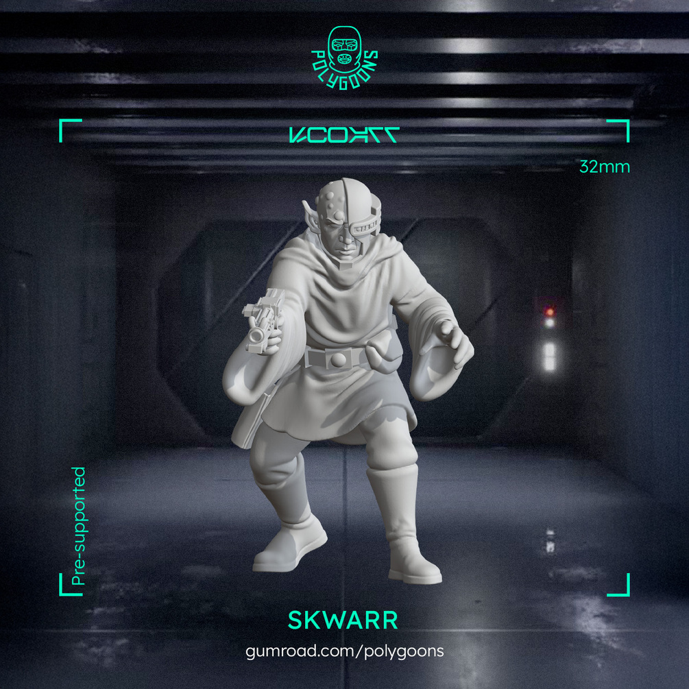 Skwarr ruthless and sadistic bounty hunter. Known for his brutality and cybernetic enhancements. Skwarr had no loyalty beyond credits. His appearance was menacing, with a partially mechanical body and a cruel sense of humor. Despite his strength and aggression, his arrogance often led to his downfall.